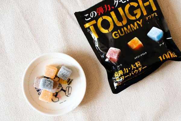 研發者表示市面上多數的軟糖都在追求女性與小朋友喜歡的口感,柔軟、溏心、爆漿質地.....而這款Tough Gummy,以大顆粒的立方體尺寸與超高的彈力見長,剛推出不久,就在迭代快速地日本軟糖大環境裡,打下瞭口碑。