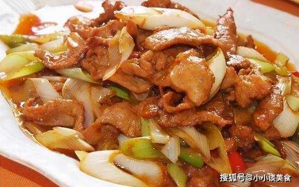 5、鍋中放入蔥段和適量的鹽,大火翻炒幾下,然後加入肉片繼續翻炒。喜歡喝湯的可以在加肉的時候沿著鍋邊放少量。一匙水。