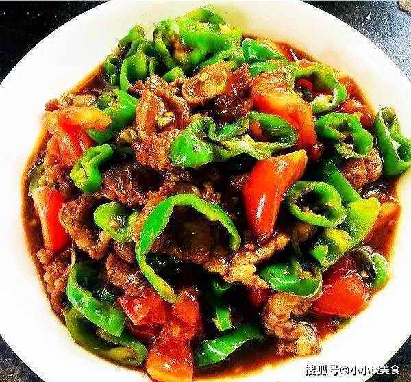 4、鍋內油少,加入西紅柿、青椒、薑絲,炒15分鐘左右。一分鐘後,放入之前炸好的牛肉絲,加入適量的鹽、蔥花、醬油,攪拌均勻即可出鍋