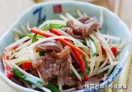 原料:牛肉1塊;去頭綠豆芽300克;1個紅甜椒;1片生薑;2個紅蔥頭;1湯匙海鮮醬油;少許糖;少許鹽;