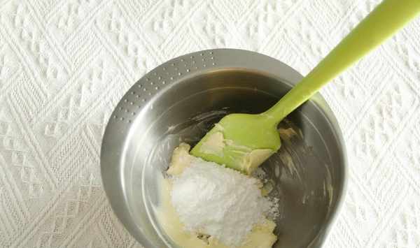 步驟3、軟化到可以用刮刀輕松抹開,倒入鹽和糖粉。拌勻至無幹粉顆粒,防止打發時候飛濺。