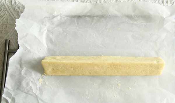 步驟10、放在油紙上,先搓成圓柱形,再借助刮板或者徒手整理成三角形,裹上油紙冷凍30分鐘。