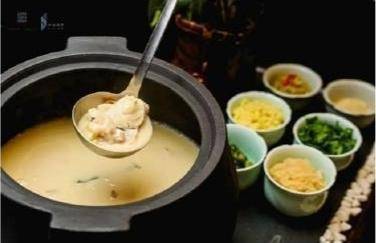 這道菜參考“茶聖”陸羽取泉煮茶的程序,選用千島湖有機大頭魚的魚唇、陸羽泉的泉水與水繪園餐廳自制的筍幹菜熬煮,待湯白唇爛後去骨裝盤。陸羽泉加上有機魚,湯味鮮美、唇香濃鬱,展杭幫菜經典,顯杭州宋韻精華。