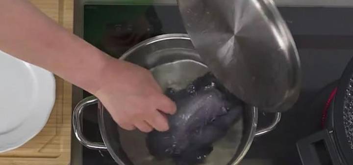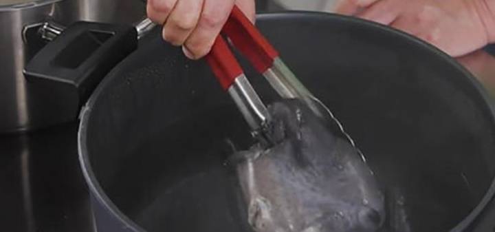 大廚會在冷水時將烏雞下鍋,以小火氽水。