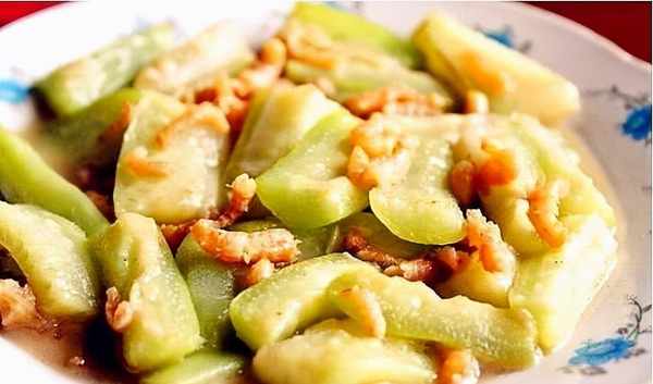 3、加入絲瓜片炒勻,加入少許泡水的海米炒至絲瓜片變軟,最後加少許鹽調味,撒上蔥花即可食用;