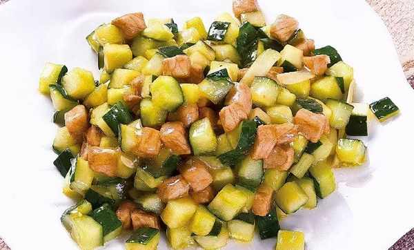 1、黃瓜洗凈,切成1厘米見方的方塊,用少許鹽醃10分鐘,擠出水分;將瘦豬肉切成大小相等的方塊備用。