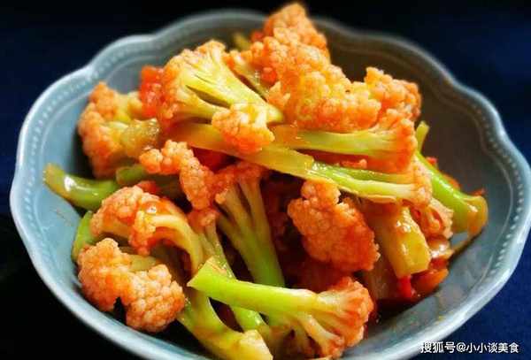 4、西紅柿炒好後,加入花菜炒至出汁。加入少許鹽和糖(可選),將番茄醬均勻塗抹在花椰菜上即可食用。