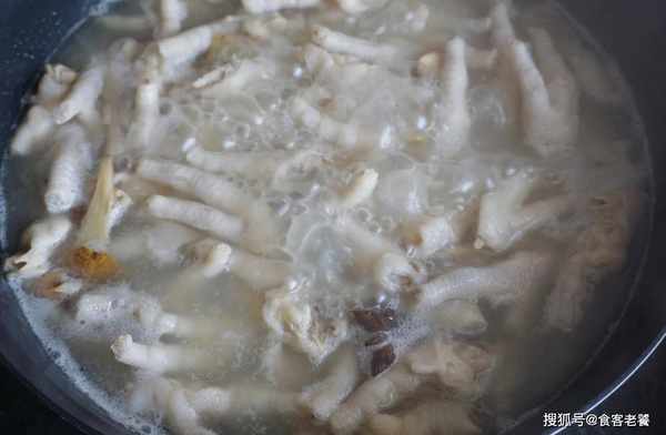 待水煮開之後下入雞爪,放入白醋和料酒再煮15分鐘,撈出之後放入冷水裡浸泡涼透。