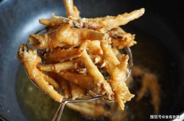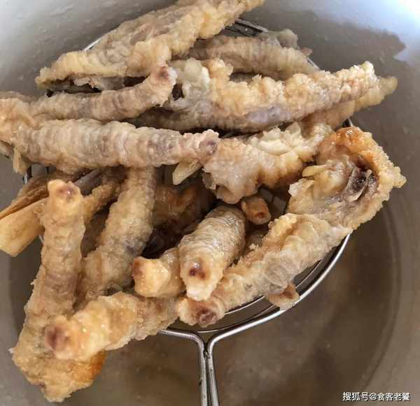 5鍋裡倒油,油燒至手放在上方有熱度時,下入雞爪炸。如果是用電磁爐就開大火,液化氣就用中大火。炸至表面金黃,即可撈出。