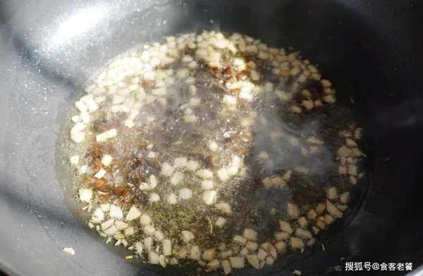 鍋裡放油,下入蒜丁、生薑開小火慢炸,炸至蒜和薑都有些幹時,下入豆豉炸出香味,接著把豆豉和蒜末撈出。