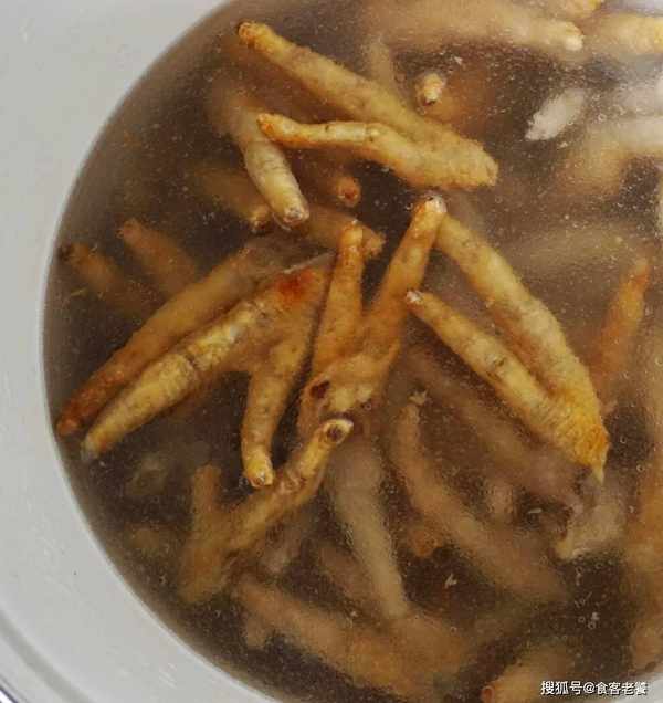 7經過幾個小時的浸泡,這時的炸雞爪已經出現瞭明顯的虎皮。如果浸泡一晚上,虎皮效果也會最佳。