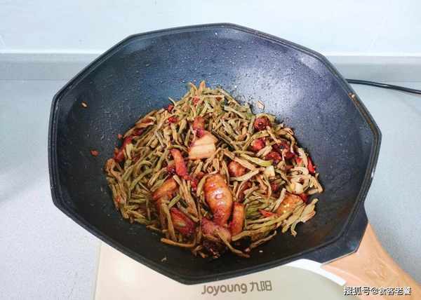 6接著倒入豆角幹翻炒均勻,加入浸沒豆角幹水量的清水,蓋上鍋蓋用中小火燉煮至鍋裡的湯汁還剩三分之一時,加入食鹽調味即可出鍋。