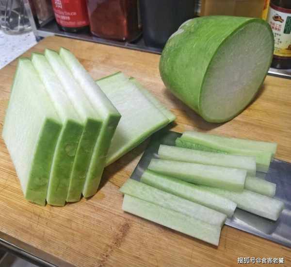 1取新鮮青蘿卜清洗幹凈,去掉兩頭後瀝幹水分。將蘿卜先切片,再切成長條。這是因為蘿卜太寬不容易曬透,太窄又不容易入味,曬幹之後也不容易成型。