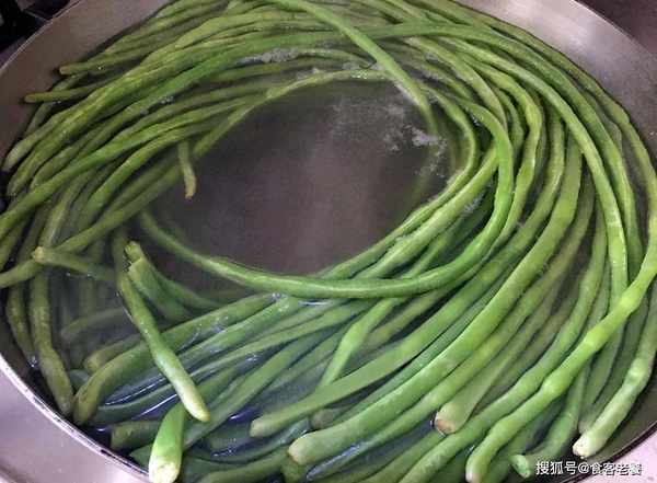 2水燒開後,下入食鹽和色拉油,放入洗凈的豆角。
