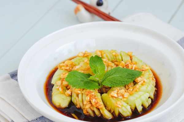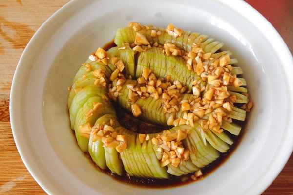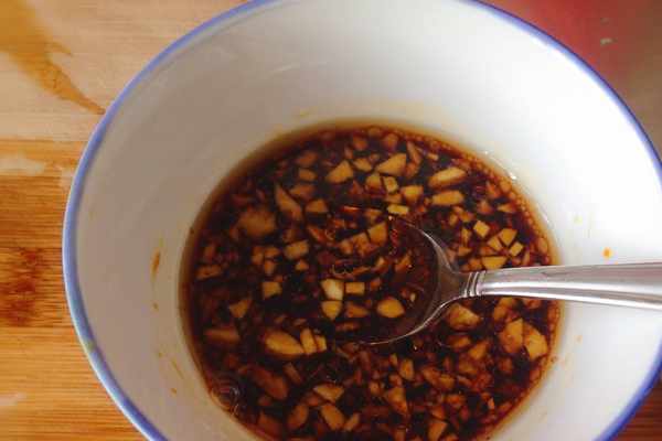 4、將切好的蓑衣黃瓜繞圈碼入盤中,把大蒜拍成蒜末後放入碗中,調入生抽、香油、香醋和白糖,攪拌均勻。