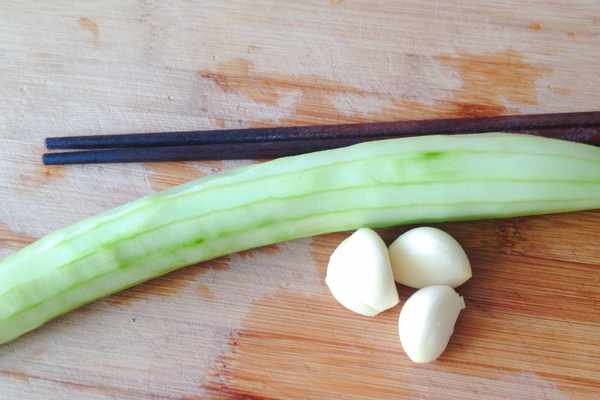 制作過程:1、首先我們要準備好制作這道【蓑衣黃瓜】需要用到的所有食材:黃瓜用削皮刀削去外皮後洗幹凈,大蒜剝去外皮洗凈備用,再準備一雙筷子。
