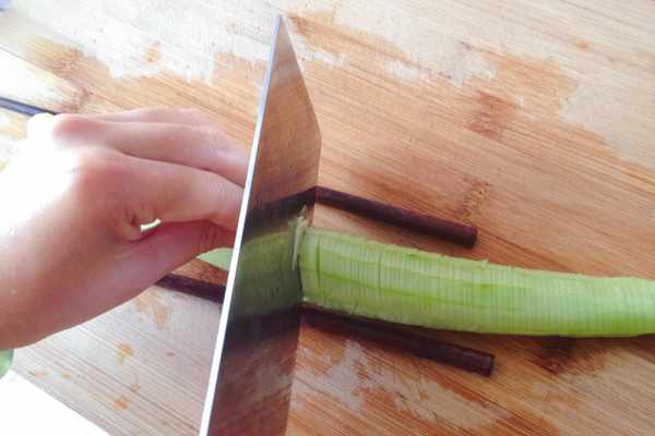 2、將筷子墊在黃瓜的兩側,然後用菜刀從右向左切,菜刀與筷子呈90°垂直,均勻地將整根黃瓜切成薄片,切得越薄蓑衣黃瓜就能拉的越長,像彈簧一樣。