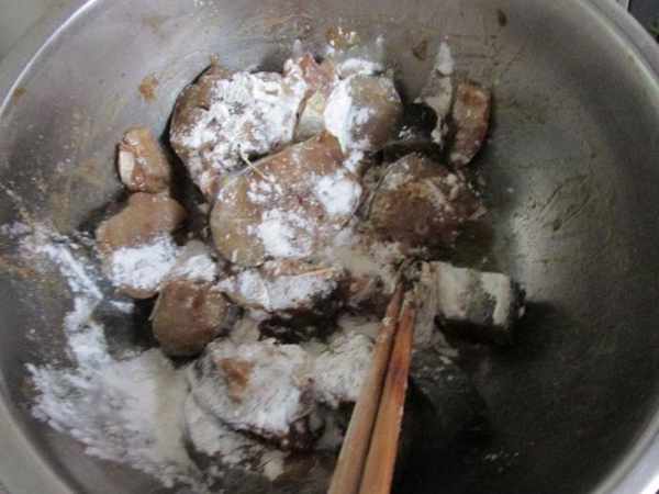 第三步:做之前把醃漬好的鮁魚撒上澱粉裹勻,薄薄的一層,這樣可以讓鮁魚中的水分不流失,吃起來口感更好。