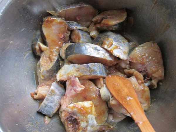 第二步:把鮁魚塊裡面加入五香粉,鹽,生抽,葱,薑攪拌均勻,醃漬一夜充分入味。