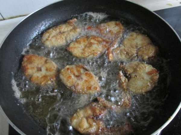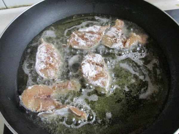 第四步:平底鍋裏加入花生油,放入鮁魚塊煎制。不用炸,煎一下就可以。