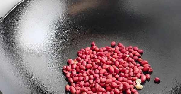 5、這時候我們再把鍋燒熱,把準備好的花生米先放在鍋內大火翻炒30秒,再倒入沒過花生米的油,轉用小火炸花生米一會,聽到花生發出滋滋的聲音就可以瞭。