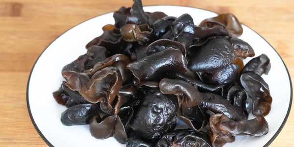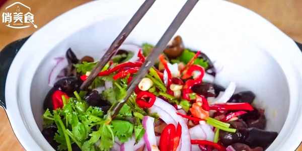 4、把木耳浸泡幾分鐘,絕對不能浸泡太久,否則會出現毒素。木耳泡發軟之後放入開水鍋中焯水3分鐘,焯熟後撈出放入盤中冷涼備用。我們再準備好兩顆香菜將它洗幹凈,切成一小段備用,還有青椒、紅椒各一根也將其去掉籽切成絲,放入碗中備用。