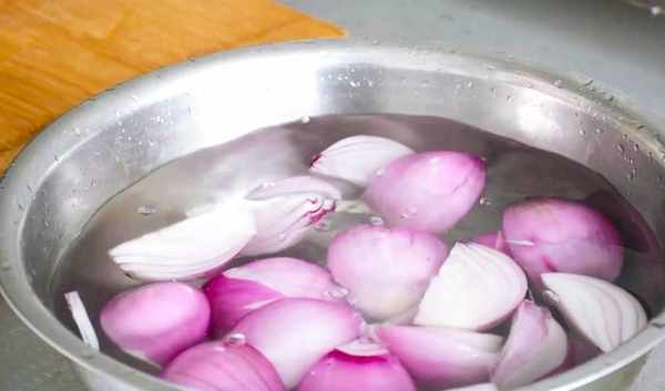 2、所有食材準備好之後,我們用刀把洋蔥的頭和尾都去掉,然後切開分為兩半,把這個切好的洋蔥放在清水裡面浸泡半分鐘。浸泡的時間不宜太久,否則會把洋蔥原本的味道全都揮發掉。浸泡的作用就在於我們稍後切的時候就不會容易辣眼睛瞭,這也是一個小秘訣哦。