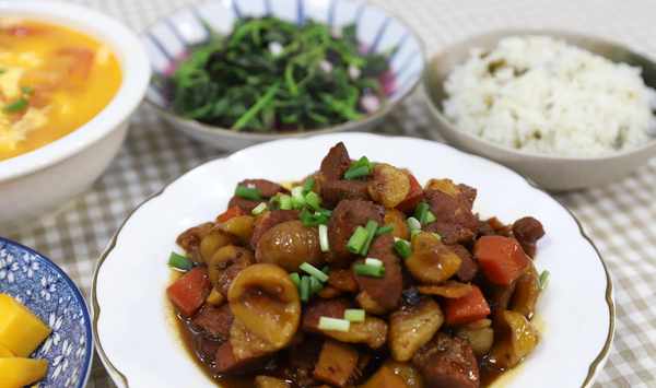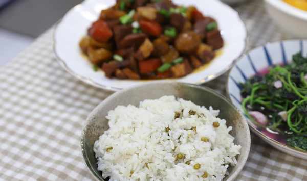 今天的晚餐:西紅柿雞蛋湯,綠豆飯,板栗燒肉,蒜蓉莧菜,芒果。