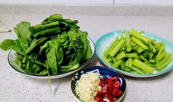 第一步:先將牛皮菜清洗幹凈,控幹水分放在菜板上面,先將莖部和葉子分別切成3厘米左右的段,然後裝入盤中,大蒜切末,幹辣椒切段,備用。