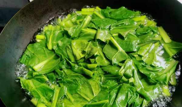 第三步:莖部焯水2分鐘左右後,再將牛皮菜的葉子也放入炒鍋中,再一起焯水大約1分鐘左右,然後撈出過冷水,控幹水分,備用。