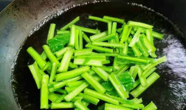 第二步:起炒鍋,鍋中加入適量清水,待水沸騰後,加入一勺食用鹽和一丟丟食用油,再將備好的牛皮菜莖部放入鍋中,先將莖部焯水大約2分鐘左右,備用。