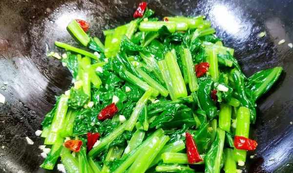 第四步:另起炒鍋,鍋中加入適量食用油,待油溫4成熱時,放入備好的蒜末和幹辣椒段,炒至鍋底爆香,接著將控幹水分的牛皮菜倒入炒鍋中,備用。