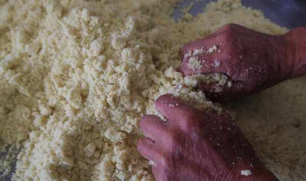 5、攪拌至比較黏稠、比較幹,可以成團的時候,就可以關火瞭。關火之後將其取出來,然後讓其放涼即可,放涼之後分成幾個均等的小劑子。把每一個劑子都團成圓球狀,然後放入模具中,使勁壓一下,綠豆糕就做好瞭。