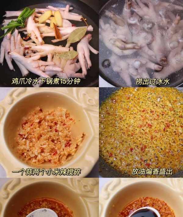 1.雞爪冷水下鍋,加蔥、薑、料酒、花椒煮15分鐘後撈出泡冰水;