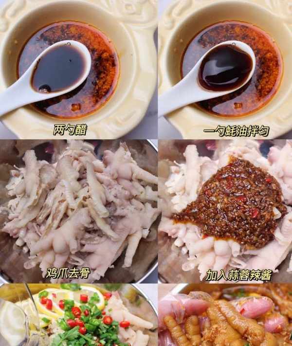 3.雞爪去骨,加入蒜蓉醬、蔥、香菜、小米辣、檸檬、涼開水拌勻醃制2小時以上即可食用。