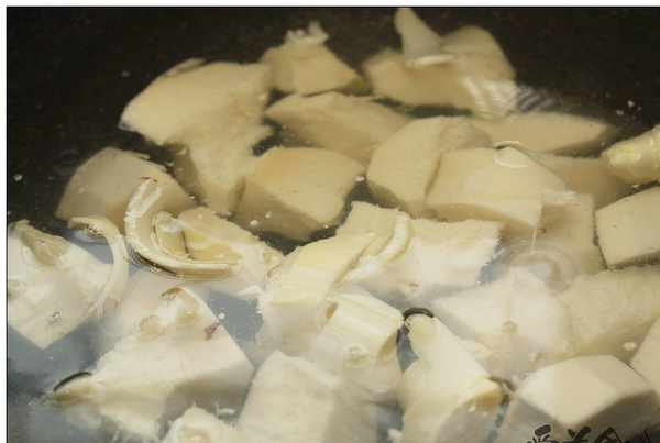 2.筍肉用小刀切成筍塊,冷水下鍋不要蓋蓋子,將其煮開,取出筍塊待用。