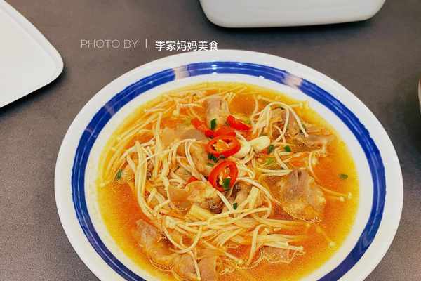 4.倒入金針菇煮熟,最後,倒入肥牛,加1勺鹽,1勺雞精,1勺生抽調味,出鍋前再撒蔥花,加少許胡椒粉就可以出鍋瞭。