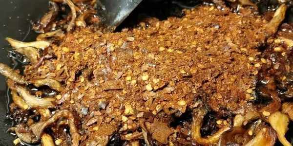 3、當平菇水分炸幹,兩面微黃時關火。待油溫降到7成熱時,放入鹽、味精、花椒油、文山丘北糊辣椒面調味即可。