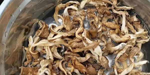 幹平菇泡水回軟後再進行油炸。