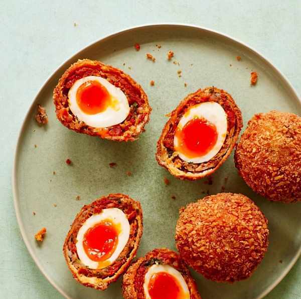 將香腸肉,香草和巴馬幹酪混合在一個碗中,將它們全部切碎,直到肉變粘為止。分成六個均勻大小的球,然後弄濕您的手,並將一個球壓扁在您的手掌中,使其盡可能細,而不會散落。輕輕地在一個去皮的雞蛋周圍均勻地切成肉,將其成型直到雞蛋完全密封為止。重復其餘的雞蛋,然後將它們全部放入冰箱中固定。