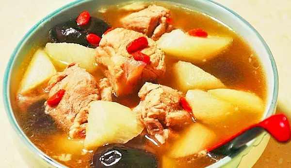3、鍋內倒入水燒開,然後加入排骨、蔥、薑片、紹酒煮40分鐘,加入山藥、大棗、鹽、雞精、香料煮10分鐘,再加入枸杞。