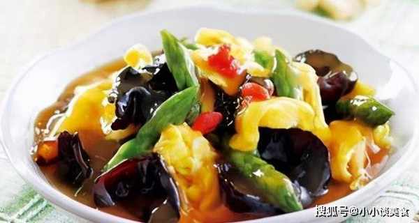 材料:蘆筍少許,香菇少許,雞蛋兩個,橄欖油少許,鮑汁少許,料酒少許,鹽,糖,生粉。