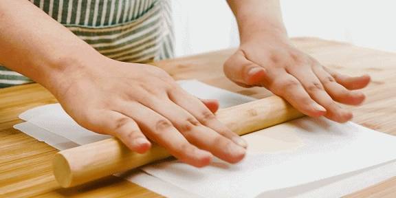 3、分別把面團放在兩張烘焙紙中,搟壓成厚度約為0.5cm的面片。放入冰箱冷藏30分鐘