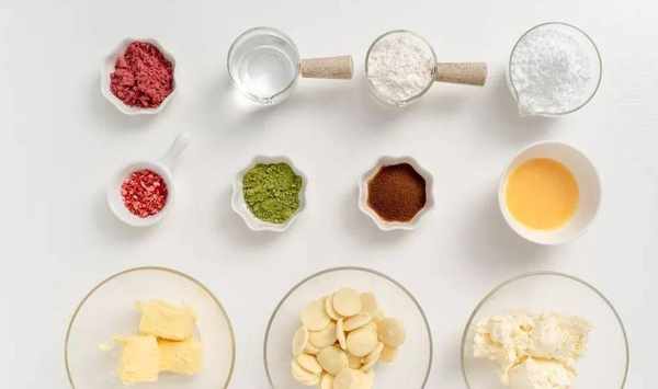 白巧克力150g/抹茶粉8g樹莓粉10g/樹莓幹3g速溶咖啡4g/水4g