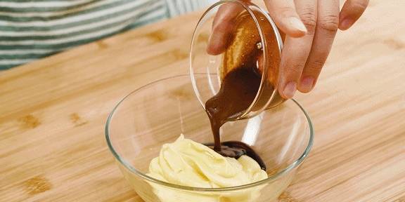 碗裡倒入150g軟化黃油、75g軟化的奶油奶酪,用手持打蛋器攪拌至順滑狀態,加入冷卻至常溫的白巧克力,攪拌均勻,基礎霜就完成瞭