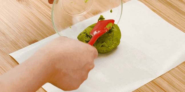 原味加60g低筋面粉,抹茶味加入4g抹茶粉和58g低筋面粉,咖啡味加入4g咖啡粉和58g低筋面粉,攪拌成團