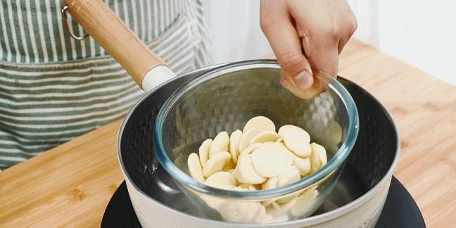 5、烘烤的時間來做餡料部分:150g白巧克力隔水融化,室溫放置冷卻至不熱的狀態