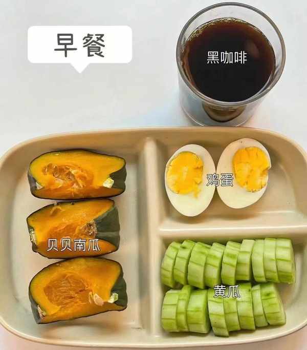 第2天早餐就吃雞蛋+南瓜+黃瓜,沖杯咖啡大概十幾分鐘,就搞定瞭,南瓜我也是頭天晚上煮好的。