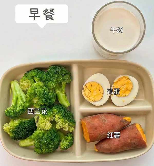 第一天早餐就是牛奶+西蘭花+雞蛋+紅薯。
