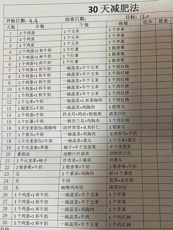 我給一位粉絲做的30天漂亮法,她一百四十斤,目標是30天瘦二十斤。大傢可以參照。